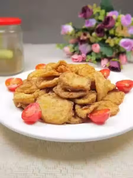 3、取出腌好的菇,先裹上面糊(最好裹厚一些),再沾一層麵包糠,放入油鍋中用小火炸至金黃色,撈出,瀝干油,裝在鋪上生菜葉的盤中。