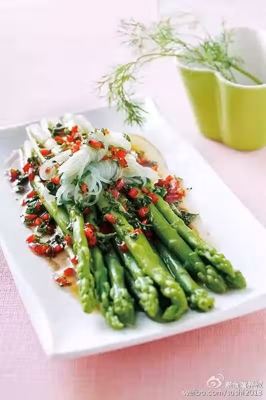 4.取一盤放入作法1的蘆筍與蒟蒻結,再撒入作法2的材料,最後再將作法3的醬汁淋在蘆筍上面即可。