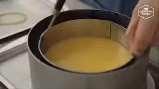 裱花袋剪個孔,沿著邊緣擠入芒果芝士液,用抹刀抹平,放入冰箱冷藏1小時