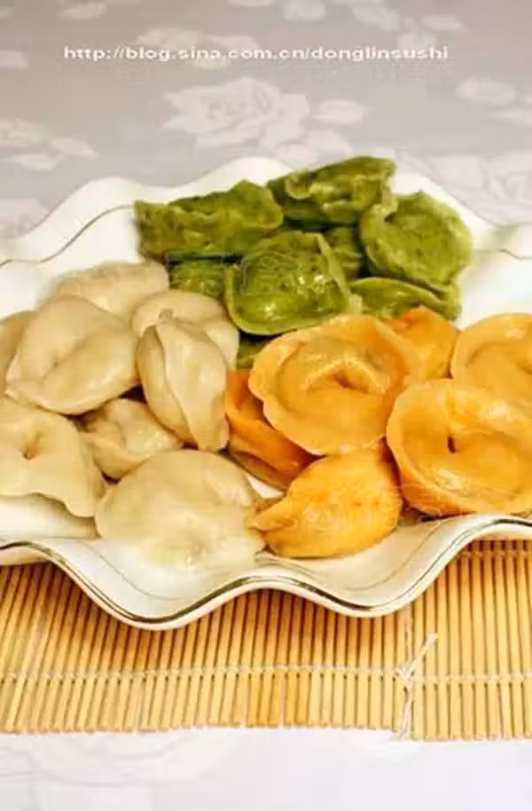 6、煮餃子:燒一鍋開水,等水沸騰時,將三種餃子放入,並及時的攪動(順時針),防止餃子在水中粘在一起。記得澆三遍涼水後,餃子就熟了。等到餃子胖胖的浮在水面上即可。煮熟後裝盤分三邊擺放。