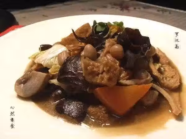 木耳 15g、銀耳 15g、娃娃菜 半顆、烤麩 半塊、草菇 6朵、花菇 3朵,、香菇 5-6朵、筍乾 30g、豆泡 10個、生花生 30g、干黃花 15g、胡蘿蔔 1根、水晶粉條 30g、油麵筋 適量、豆腐 50g、白果 10顆、松茸 1朵、荸薺 5個、香油 20g、花生油 適量、老抽 兩茶匙、生抽 一茶匙、糖 一茶匙,、鮮姜 適量,、鹽、香葉 兩片、桂皮 一小塊。