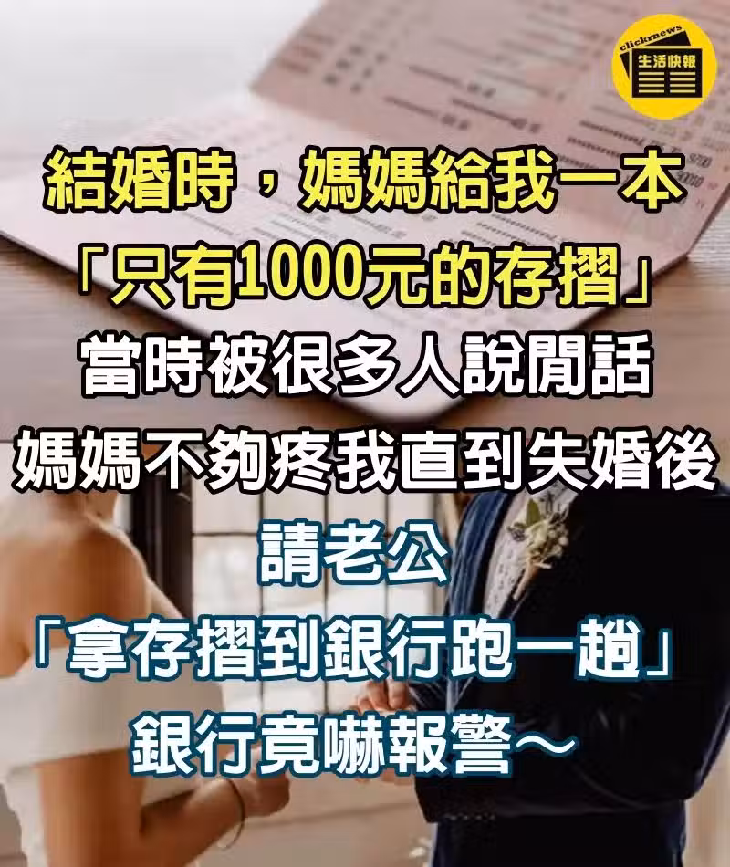 結婚時,媽媽給我一本 「只有1000元的存摺」,當時被很多人說閒話,媽媽不夠疼我,直到失婚後,請老公「拿存摺到銀行跑一趟」,銀行竟嚇報警~