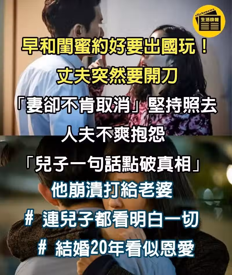 夫妻看似恩愛20年!丈夫開刀「妻子早約好和閨蜜出遊」不肯取消 人夫抱怨「兒子一句話揭真相」他崩潰了
