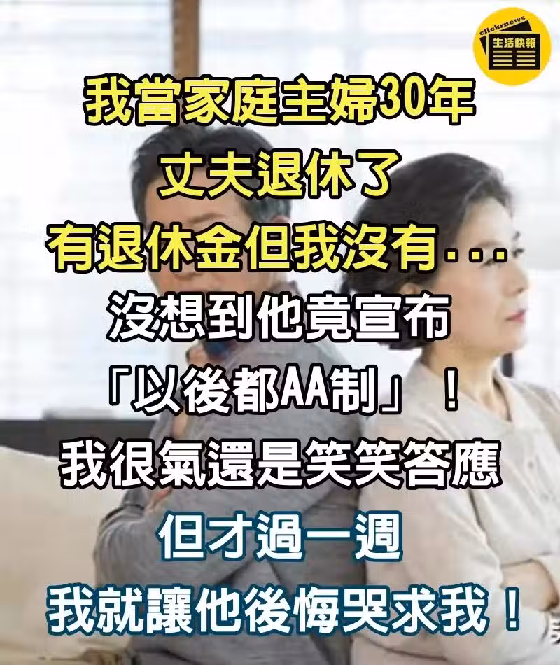 我當家庭主婦30年了!丈夫退休竟要求「從此和我AA制」 我氣炸但還是笑笑答應「一周後卻換他後悔求我」