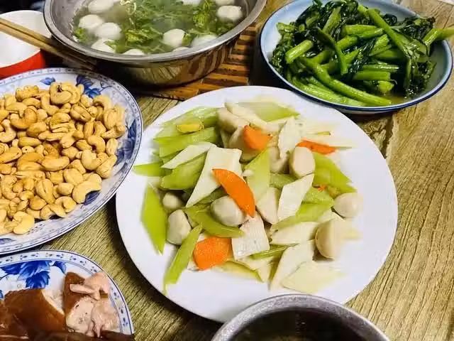 我說:每次你給我三十元五十元(約台幣1-200多),我每次都會做六道菜,或者八道菜,都是葷素搭配。