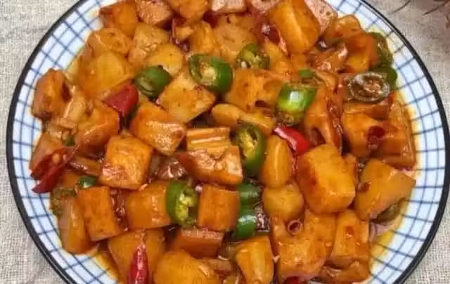 2、鍋中加少許油,倒入蒜末,干辣椒段,小火炒香,倒入焯水後的土豆蓮藕丁翻炒幾下,加一點點鹽+1勺香辣醬+青椒段+半勺老抽+1勺白糖+半碗澱粉水炒至濃稠即可。
