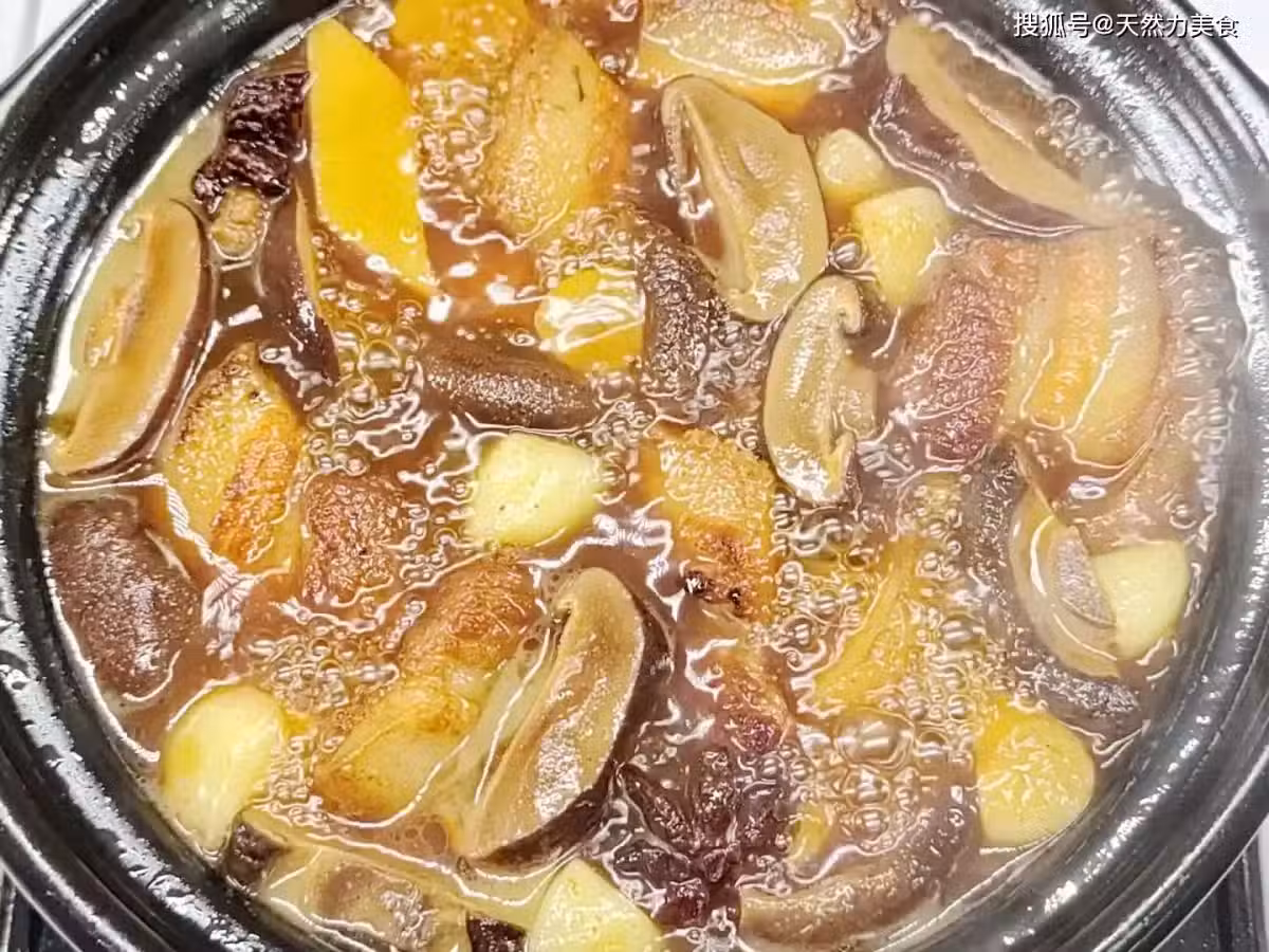 8、秒表滴答滴答很快就走了30分鐘,這時候就可以開蓋,然後把控干水分的腐竹倒進砂鍋內,攪拌幾下,讓腐竹都能吸收到湯汁,攪拌均勻後,還是保持小火,加蓋燜10分鐘。