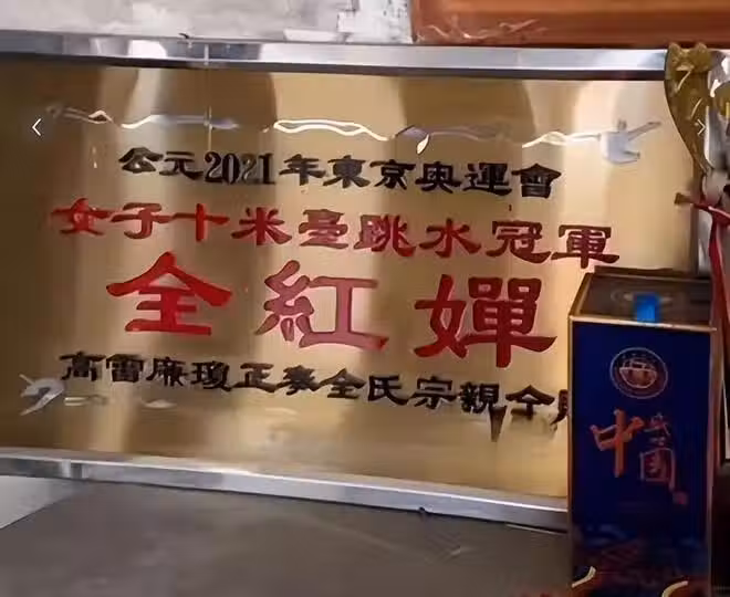 獎牌上面寫著東京奧運會,女子十米台跳水冠軍,全紅嬋。高雷廉瓊正奉全氏宗親全員贈送。