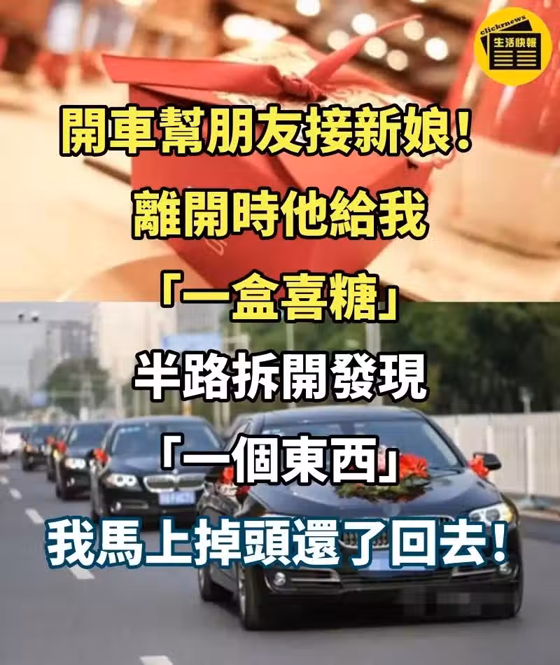 開車幫朋友接新娘! 離開時他給我「一盒喜糖」 半路拆開發現「一個東西」我馬上掉頭還了回去