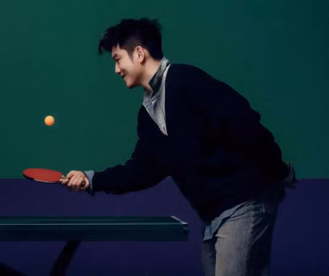 樊振東坐在椅子上,左手夾住桌球,一臉平靜,展現樊振東冷峻的一面。樊振東坐在球桌上,又顯得青春洋溢。