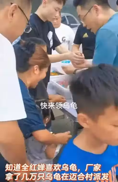 15 日,有廠家知道全紅嬋喜歡烏龜,就自髮帶著幾萬隻烏龜到邁合村派發。