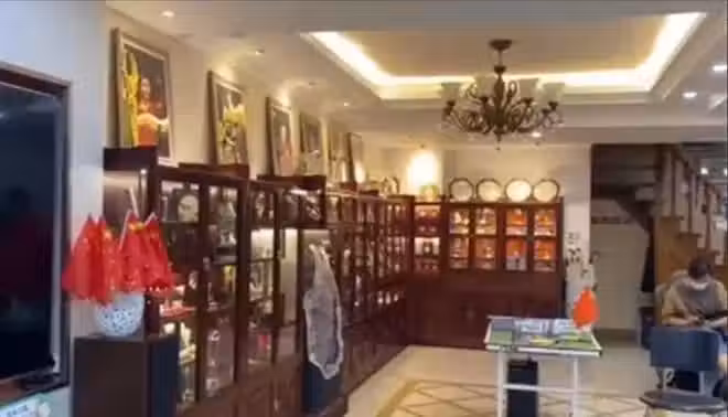 照片背景是她的家裡,客廳非常大,後面全是她的獎牌。
