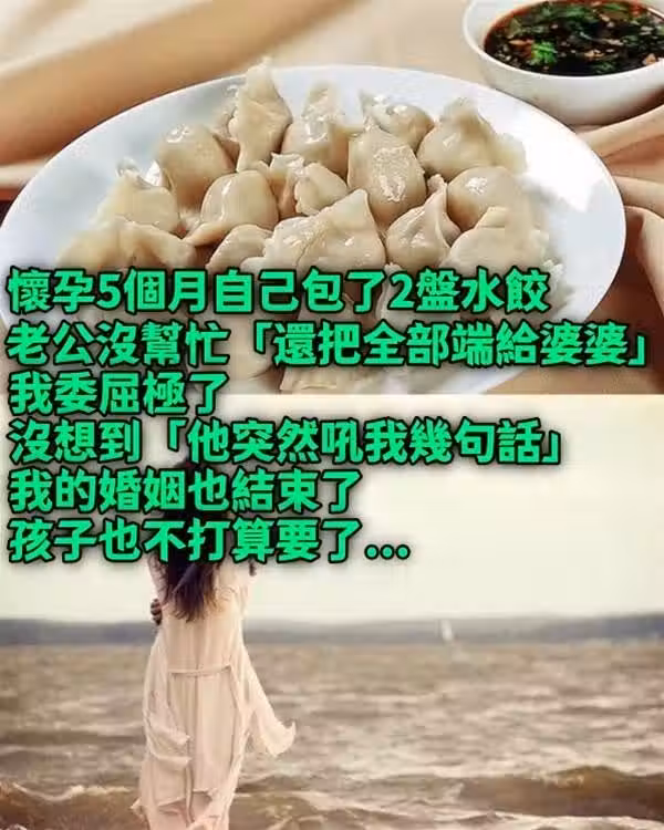 懷孕5個月自己包了2盤水餃!老公沒幫上忙「還把全部端給婆婆」我委屈極了,沒想到「他突然吼我幾句話」我的婚姻也結束了,孩子也不打算要了...