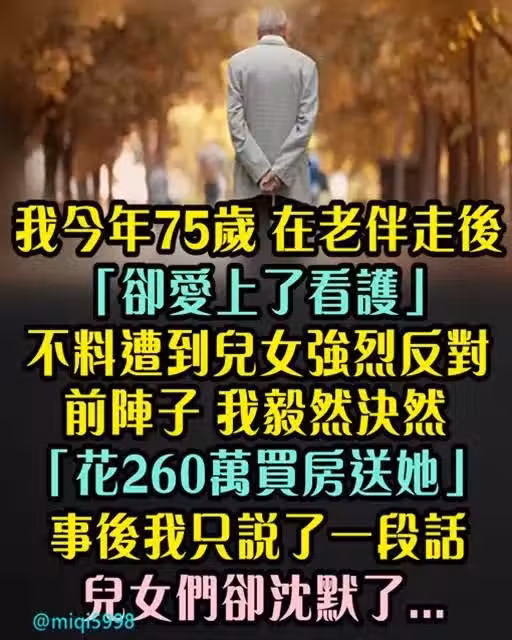 我今年75歲,在老伴走後「卻愛上了看護」遭到兒女強烈反對。前陣子,我毅然決然「花260萬買房送她」事後我只說了一段話,兒女卻沉默了...