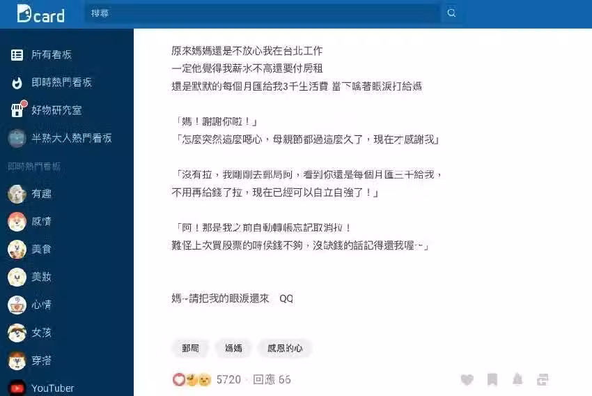 我今天挖出了大學常用的金融卡,好奇一查金額,才發現媽媽多年來每個月都會轉3000元給我,我猜一定是她擔心我在台北錢不夠用,才會默默匯錢支持我。我感動地立即打電話跟她道謝,電話接通後我眼淚卻縮了回去!