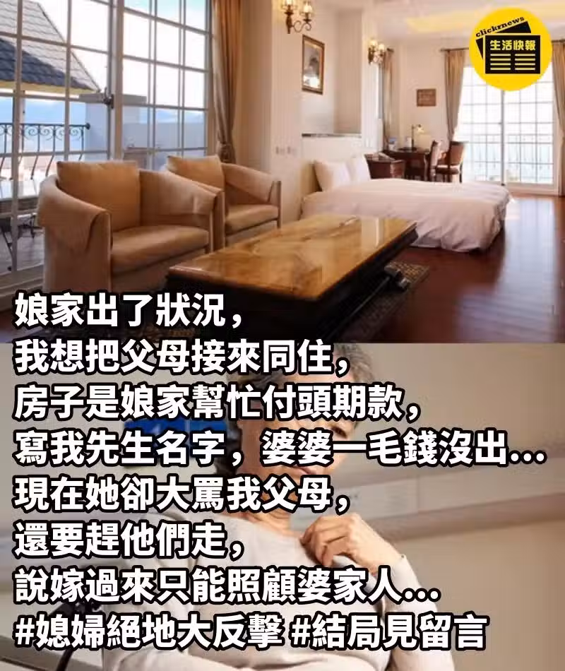 娘家出了狀況,我想把父母接來同住,房子是娘家幫忙付頭期款,寫我先生名字,婆婆一毛錢沒出...現在她卻大罵我父母,還要趕他們走,說嫁過來只能照顧婆家人...#媳婦絕地大反擊 #結局見留言
