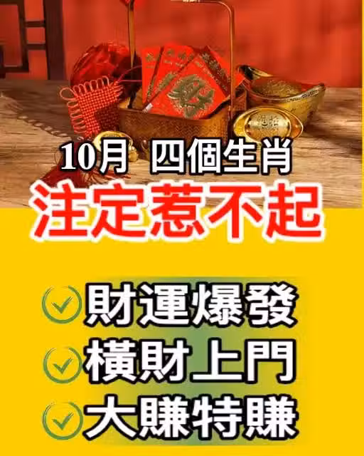 在中國傳統文化中,生肖不僅代表著出生年份的符號,更蘊含了豐富的民俗文化與命運觀念。每當歲末年初,人們總愛根據生肖運勢來預測新一年的吉凶禍福,尤其是在某些特定的月份,某些生肖似乎被命運之神特別眷顧,迎來了前所未有的好運。如今,隨著金秋十月的到來,有四個生肖仿佛被幸運之光照耀,財運如潮水般洶湧而來,橫財不請自來,大賺特賺,讓人不禁感嘆:「大難已過,10月註定惹不起!」