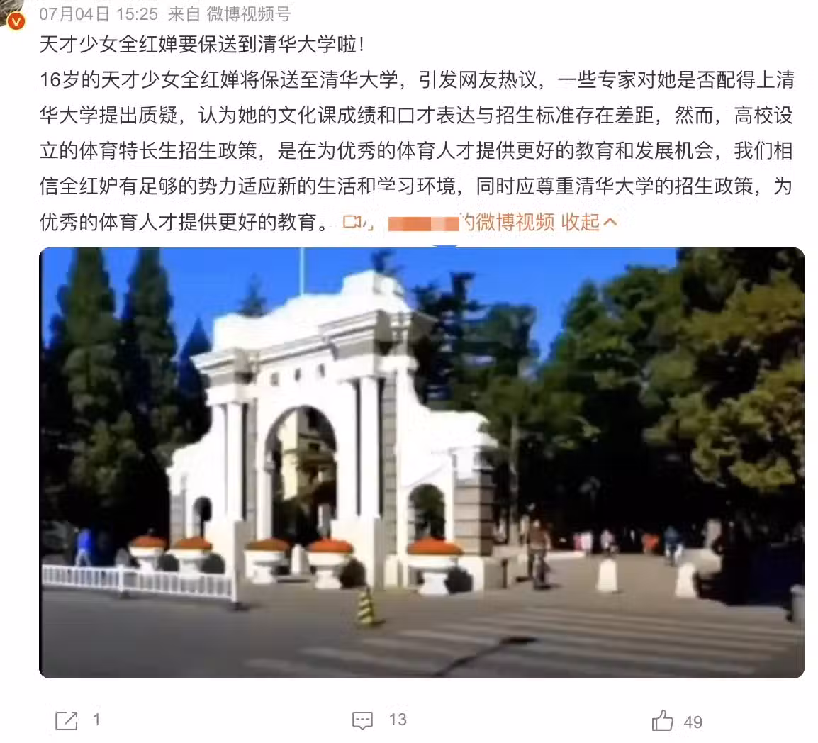 首先從這個媒體人發布的動態,可以看到他聲稱全紅嬋很快就要保送到清華大學,還提到全紅嬋的貧苦出身以及經歷,擔心全紅嬋會因此遭到不少的質疑。在這條動態上,這個媒體人還特意放上了全紅嬋的一段視頻,說的好像是真的一樣。實際上我們只要稍微分析一下就可以發現關於全紅嬋要保送到大學的消息根本就是假的,完全是個謠言。