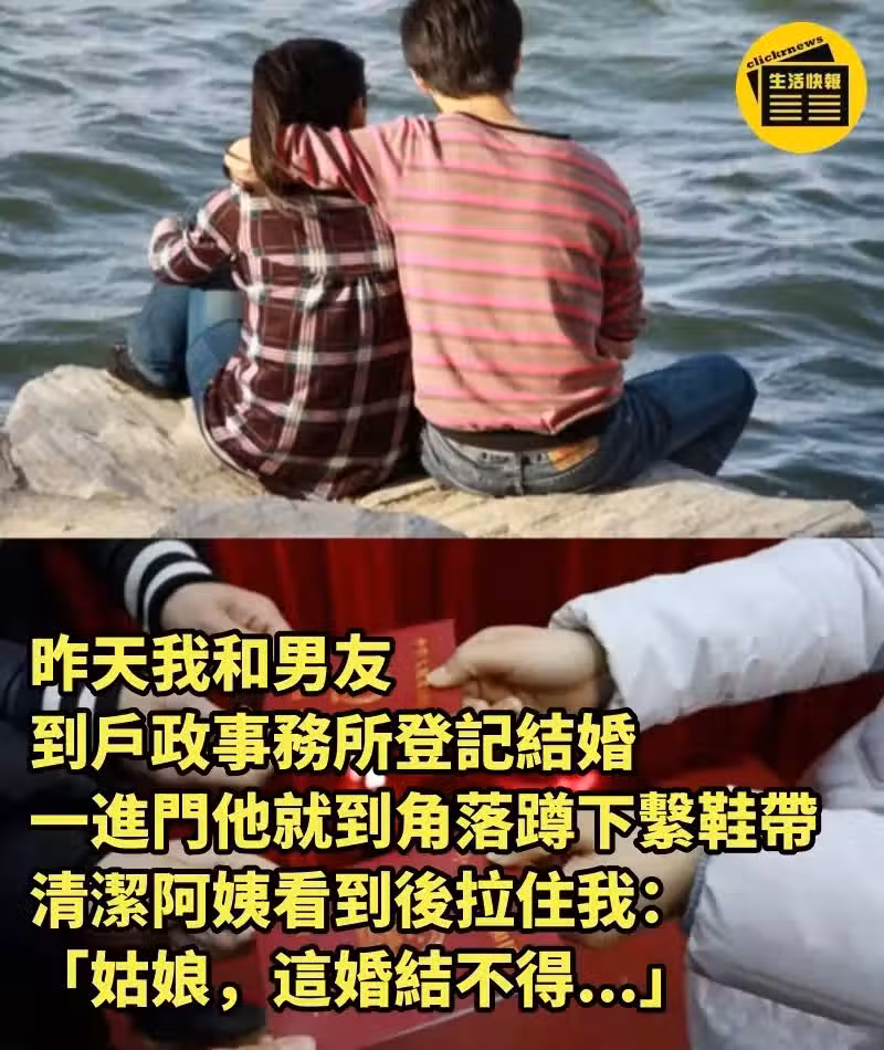 昨天,我和男友到戶政事務所登記結婚,一進門他就到角落「蹲下繫鞋帶」,清潔阿姨看到後拉住我:「姑娘,這婚結不得...」