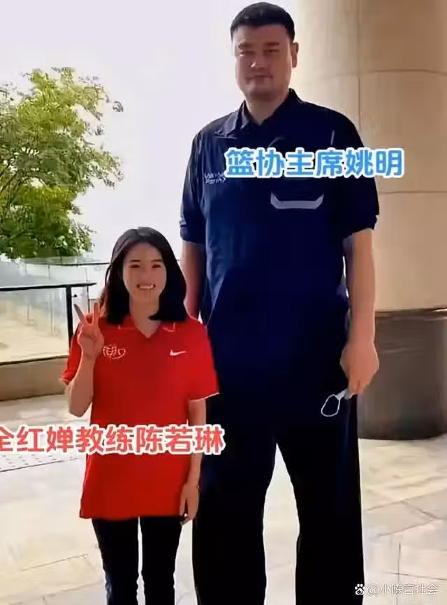 這個場景讓人不禁想起了另一個經典的身高對比畫面——陳若琳和姚明站在一起的照片。當時,陳若琳站在姚明旁邊,顯得格外嬌小。而現在,全紅嬋和姚明的身高差距同樣驚人,這種強烈的反差感讓人忍不住發笑。