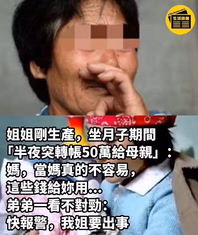 姐姐剛生產, 坐月子期間「半夜突轉帳50萬給母親」:媽,當媽真的不容易,這些錢給你用... 弟弟「一看不對勁」:快報警,我姐要出事