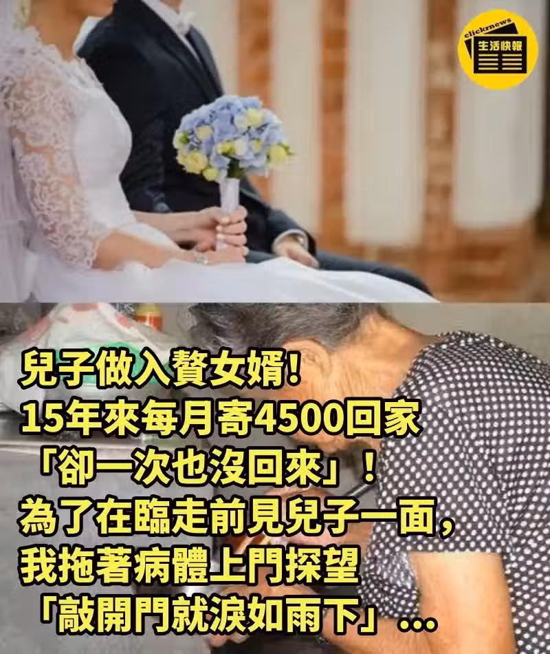 兒子做入贅女婿!15年來每月寄4500回家「卻一次也沒回來」!為了在臨走前見兒子一面,我拖著病體上門探望「敲開門就淚如雨下」...