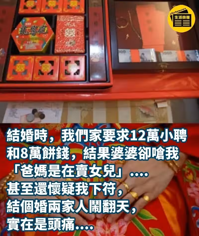 結婚時,我們家要求12萬小聘和8萬餅錢,結果婆婆卻嗆我「爸媽是在賣女兒」....甚至還懷疑我下符,結個婚兩家人鬧翻天,實在是頭痛....