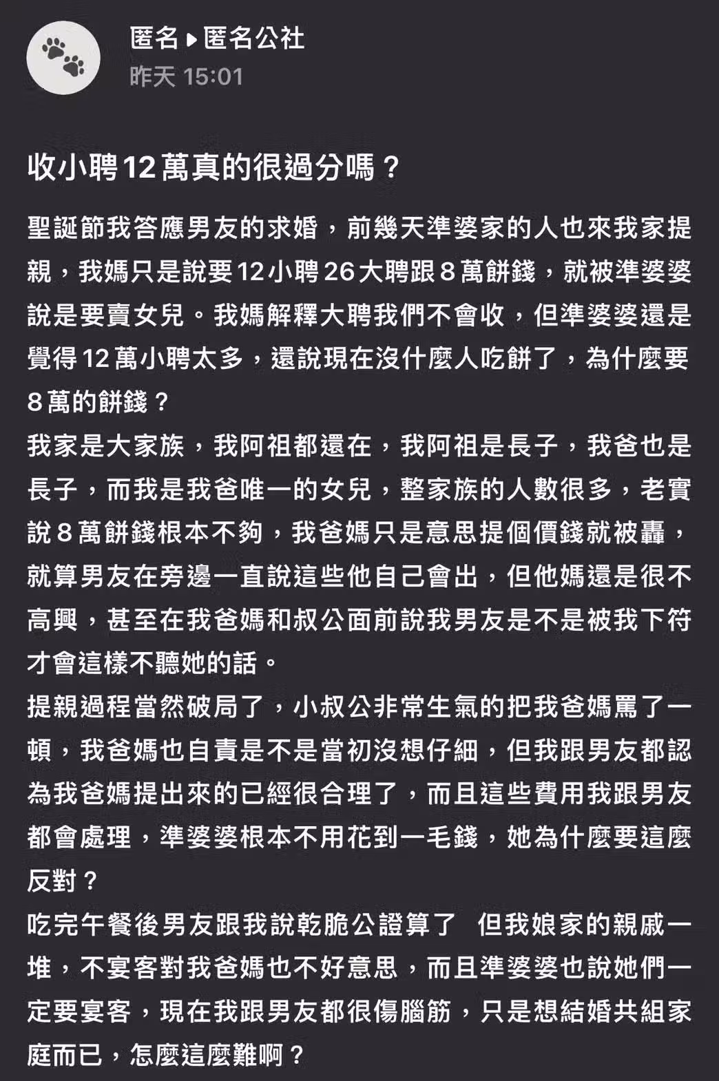 原PO解釋因為是大家族,曾祖父、父親都是長子,她也是家中唯一的女兒,家族人數很多,其實8萬餅錢根本就不夠,沒想到爸媽只是提一個價格就被准婆婆炮轟,男友也在一旁緩頰說由他負責聘金就好,男友母親仍相當不滿,甚至認為兒子是遭原PO「下符」才不聽話。