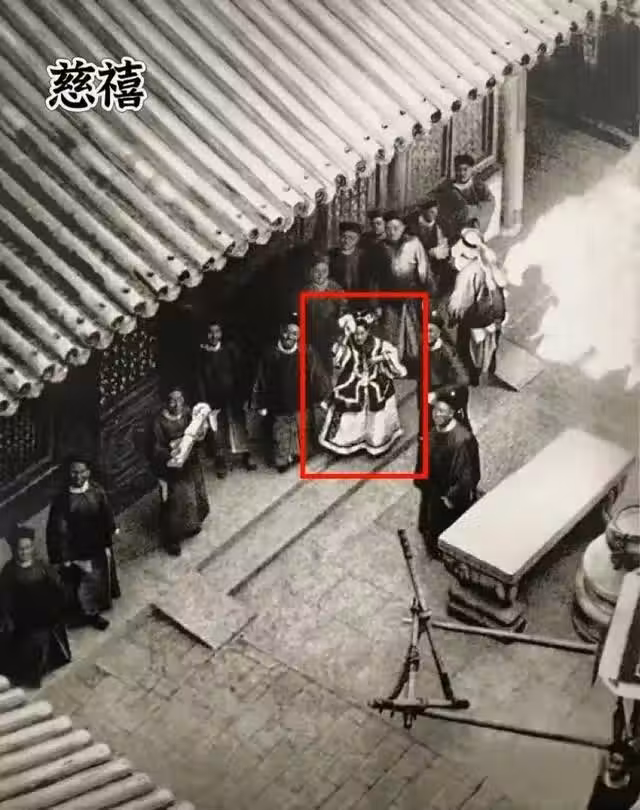 仔細看這張照片,攝影師明顯是從房頂的角度去拍的,讓人意外的是,按理說,慈禧老佛爺身邊應該左擁右護的,怎麼沒有發現攝影師嗎?