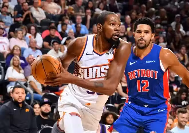 第二,瓊斯得到了極大的認可和球權支配,三場比賽一共送出16次助攻,但是和杜蘭特以及比爾關係不大。最簡單的例子,兩場打活塞,杜蘭特無球的時合,幾乎沒有跑動,就在兩個肋部等著隊友傳球,要麼單打,要麼在對方還沒上包夾時,就隨意出球,隊友甚至還不是空位。說隨意也好,說一直養成的習慣也罷,直接後果是失誤,而且太陽進攻打不出配合,唯一有所成效的,反而是內線的普拉姆利扮演策應點。說到底,三巨頭+瓊斯,一個球明顯不夠。無球的時候,杜蘭特真有些消極情緒。從當初籃網時期和哈登在一起時,就能發現。