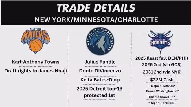 迪溫琴佐的合同只有4年4700萬美元,性價比超高,尼克斯為啥交易他?尼克斯也想留下迪溫琴佐,但森林狼點名要他,尼克斯不給不行。迪溫琴佐跟布倫森不僅是大學隊友,也是布倫森婚禮的伴郎,今天發生這種事,不知道如何收場……