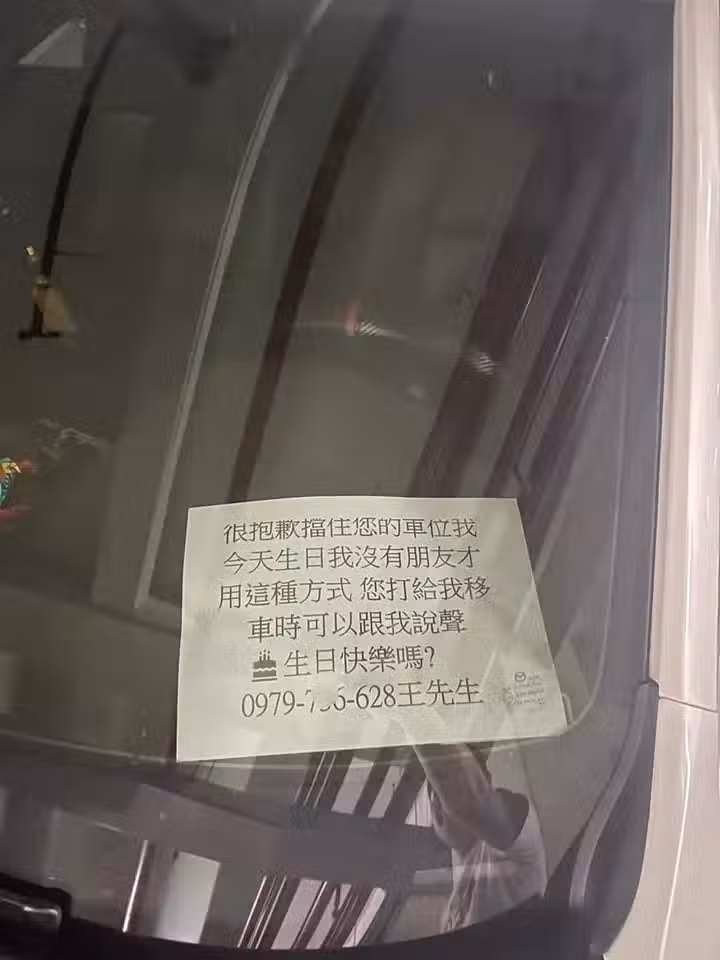 不過近期卻有網友分享自己遇到的無言情況,他表示自己的車位已經被陌生車輛擋了一整個禮拜,擋風玻璃下擺著內容超讓人傻眼的紙條,只見上面寫著:「很抱歉擋住您的車位,我今天生日,但沒有朋友才會用這種方式,您打給我移車時可以跟我說聲生日快樂嗎?」但原PO忍不住吐槽:「你生日是過一個月嗎?」