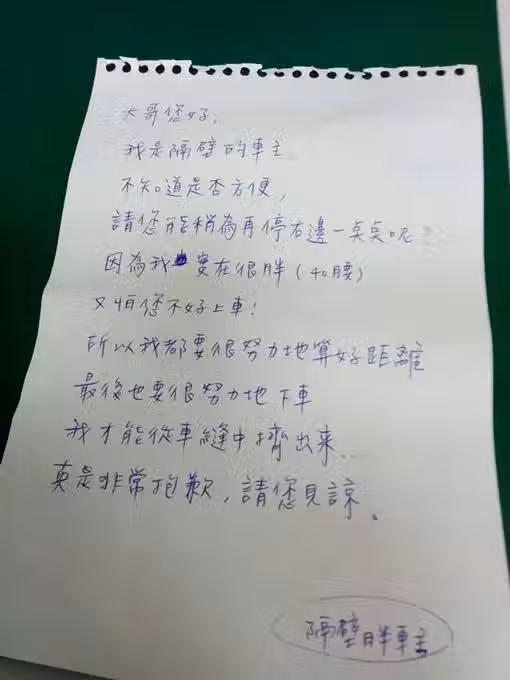 之前也有網友分享過自己收到的逗趣紙條,對方客氣寫道:「大哥您好,我是隔壁的車主,不知道是否方便,請您能稍微再停右邊一點點呢?」「因為我實在很胖(40腰),又怕您不好上車!所以我都要很努力地算好距離,最後也要很努力地下車,我才能從車縫中擠出來....真是非常抱歉,請您見諒。」最後並附上「隔壁胖車主」的署名,只能說情商真的好高啊~(圖片來源:爆廢公社)