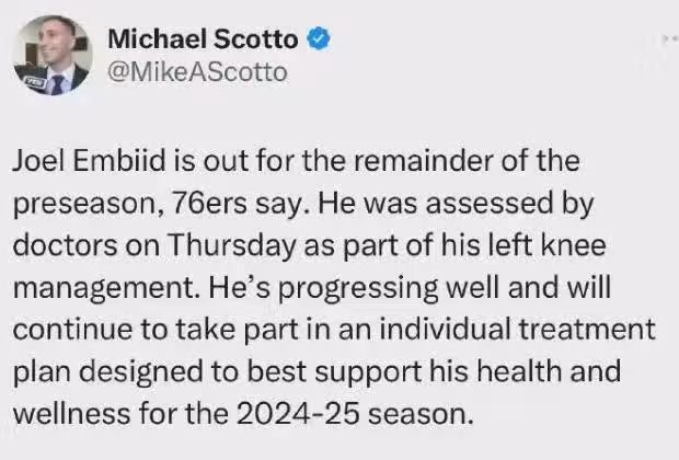 75人官方宣布:大帝將不會出戰剩餘的季前賽比賽。