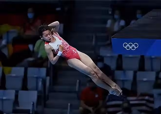 她起跳、翻騰、入水的動作像羽毛一般輕盈,精準而有力地展現了「水花消失術」。