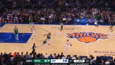 迪溫琴佐利用哈騰的掩護擺脫豪瑟後果斷突波爾津吉斯,突至籃下吸引凱爾特人收縮防線後傳給了外線的哈特。稍作調整,哈特命中三分。