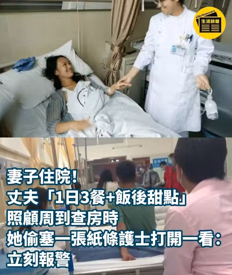 妻子住院!丈夫「1日3餐+飯後甜點」照顧周到 查房時「她偷塞一張紙條」護士打開一看:立刻報警