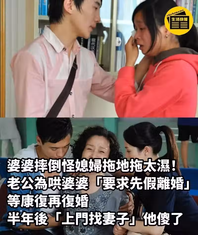 婆婆摔倒怪媳婦拖地拖太濕! 老公為哄婆婆「要求先假離婚」等康復再復婚,半年後「上門找妻子」 他傻了
