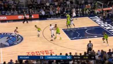 藉助濃眉掩護,隆多的突破很好將森林狼球員牽制在了強側,從而導致弱側米羅蒂奇處於絕對空位。需要說明的是,當米羅蒂奇出手時吉布斯已經完全飛撲到位。換言之,米羅蒂奇具備一定三分強投能力。