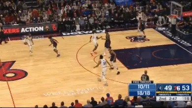 提上為康利假掩護后里德快速外拆,然後接到前者傳球完成三分終結。單就這個回合而言,恩比德完全沒有失位並且給了很好的干擾。