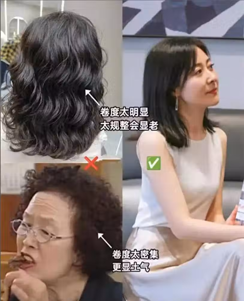 帶點卷度的短髮雖然是中年女性的首選,但是卷度燙錯了也會分分鐘翻車, 一定要避開細小的「大媽卷」,這樣的大媽卷不但不顯發量,還下意識的就讓人注意到發量,成了禿頭女性的代名詞。