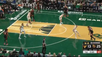 德羅贊的突破有效吸引凱爾特人包夾,從而使卡魯索處於空位狀態。事實上,在後者出手三分瞬間塔圖姆已經完全飛撲過來。