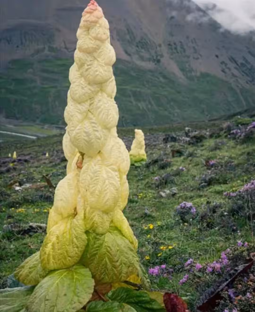 塔黃是一種只分布在喜馬拉雅山麓的高山植物,通常生長在海拔4400米以上的石灘地帶。它的外形非常獨特,整個植株呈現粗壯挺拔的形態,通體淡黃色。塔黃的葉片寬大,葉脈清晰,植株高度可達數米。