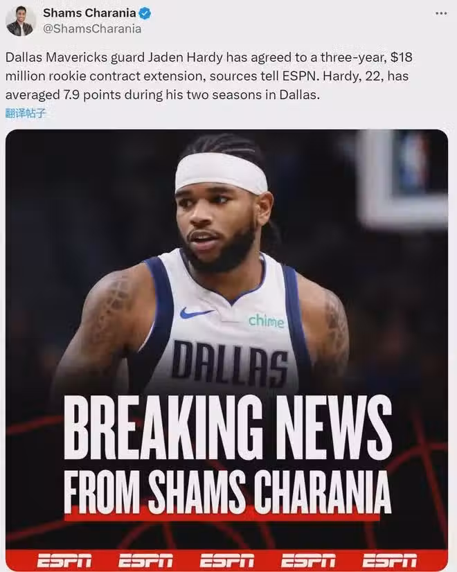 如今NBA大合同滿天飛,大家可能忽略了一則簽約消息:獨行俠3年1800萬提前續約傑登-哈迪,最後一年球隊選項。哈迪目前是3年476萬美元的新秀合同,2025年夏天到期,本賽季薪水202萬。獨行俠把合同延長至2028年,均薪600萬。