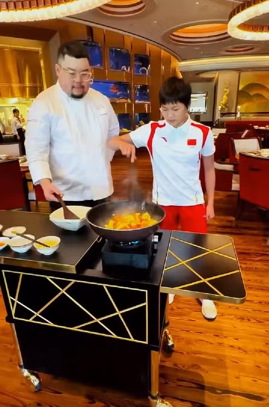 奧運健兒們與餐廳行政總廚張志成趣味互動,總廚在一旁打下手,全紅嬋的奧運冠軍版西紅柿炒雞蛋新鮮出爐。