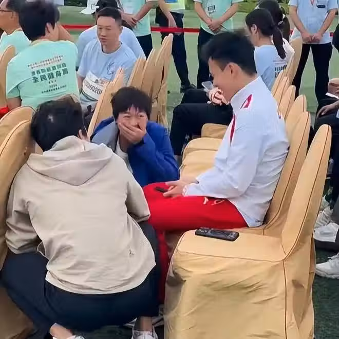 在跑步結束之後,全紅嬋又和王宗源還有謝思埸「混」到了一起,此時他們三個人特別像「同村發小」見面一樣,全紅嬋蹲在地上捂著嘴笑。