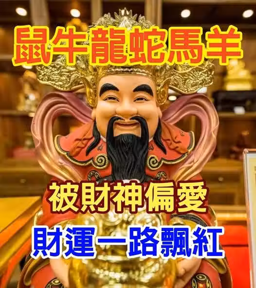 財神偏愛生肖(鼠、牛、龍、蛇、馬、羊),財運一路飄紅,偏財正旺雙喜臨門