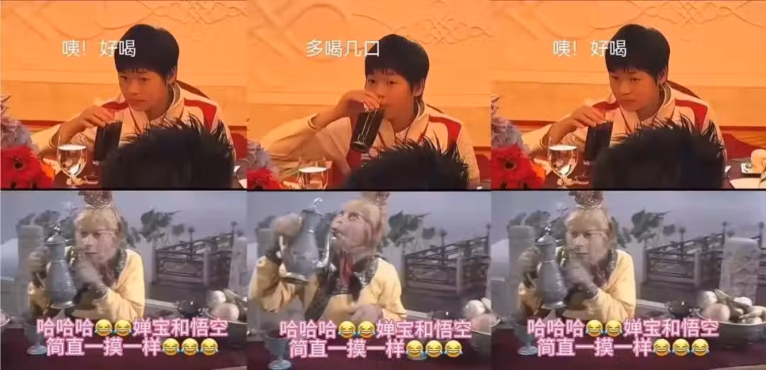 這不網絡上找考古視頻還不容易,立馬就有網友找到了,當年孫悟空偷喝御酒的視頻,把全紅嬋和孫悟空的兩個視頻放在一起,別說還真的很神似。