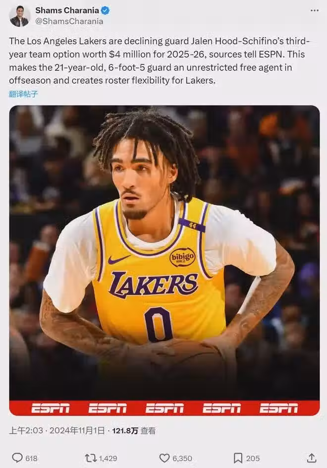 11月1日凌晨,據ESPN名記Shams報道,湖人宣布放棄執行席菲諾2025-26賽季的球隊選項(價值400萬美元),他將在明年夏天成完全自由球員。席菲諾是四年新秀合同,第三年和第四年是球隊選項,湖人直接放棄了後兩年。