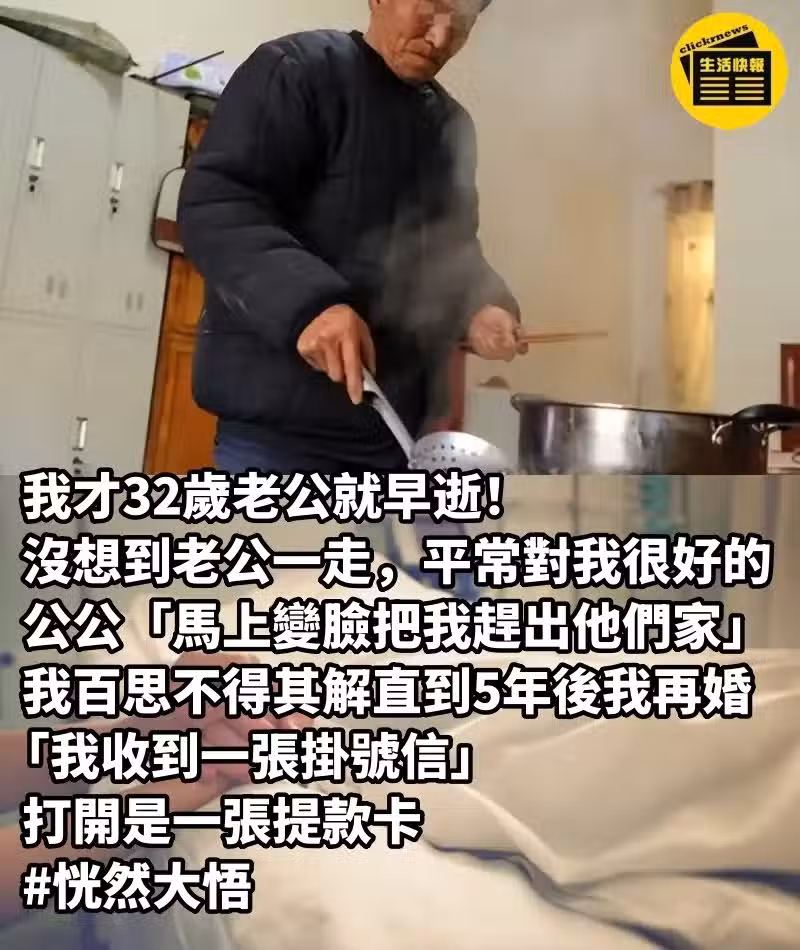 我才32歲老公就早逝! 沒想到老公一走,平常對我很好的公公「馬上變臉把我趕出他們家」....我百思不得其解,直到5年後我再婚「我收到一張挂號信」打開是一張提款卡#恍然大悟